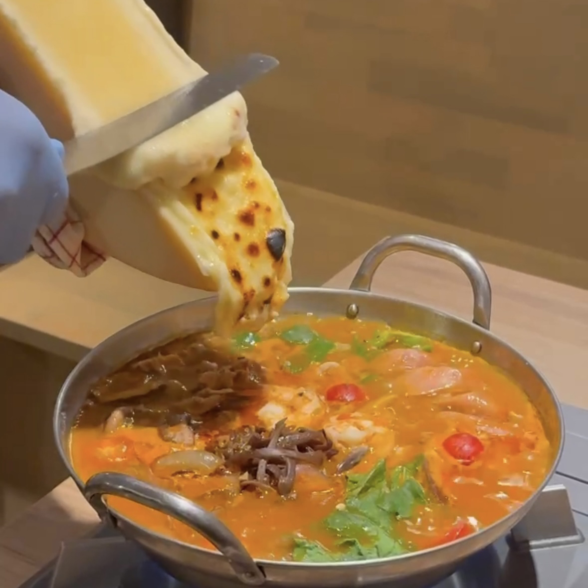 ディナーの【トマト麻辣鍋】にはラクレットチーズのトッピングができます◎