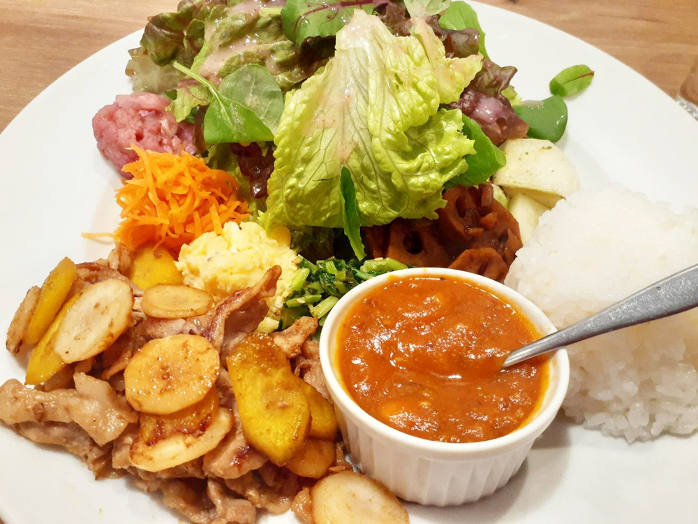 メインのおかずに副菜が約5種、ミニカレーも付いたヘルシーなランチ。